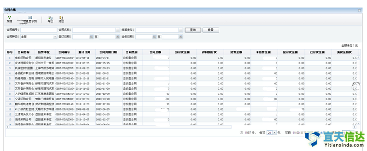 n 支持按合同種類、結(jié)算單位、合同簽訂日期、按業(yè)務(wù)日期查詢合同臺帳信息