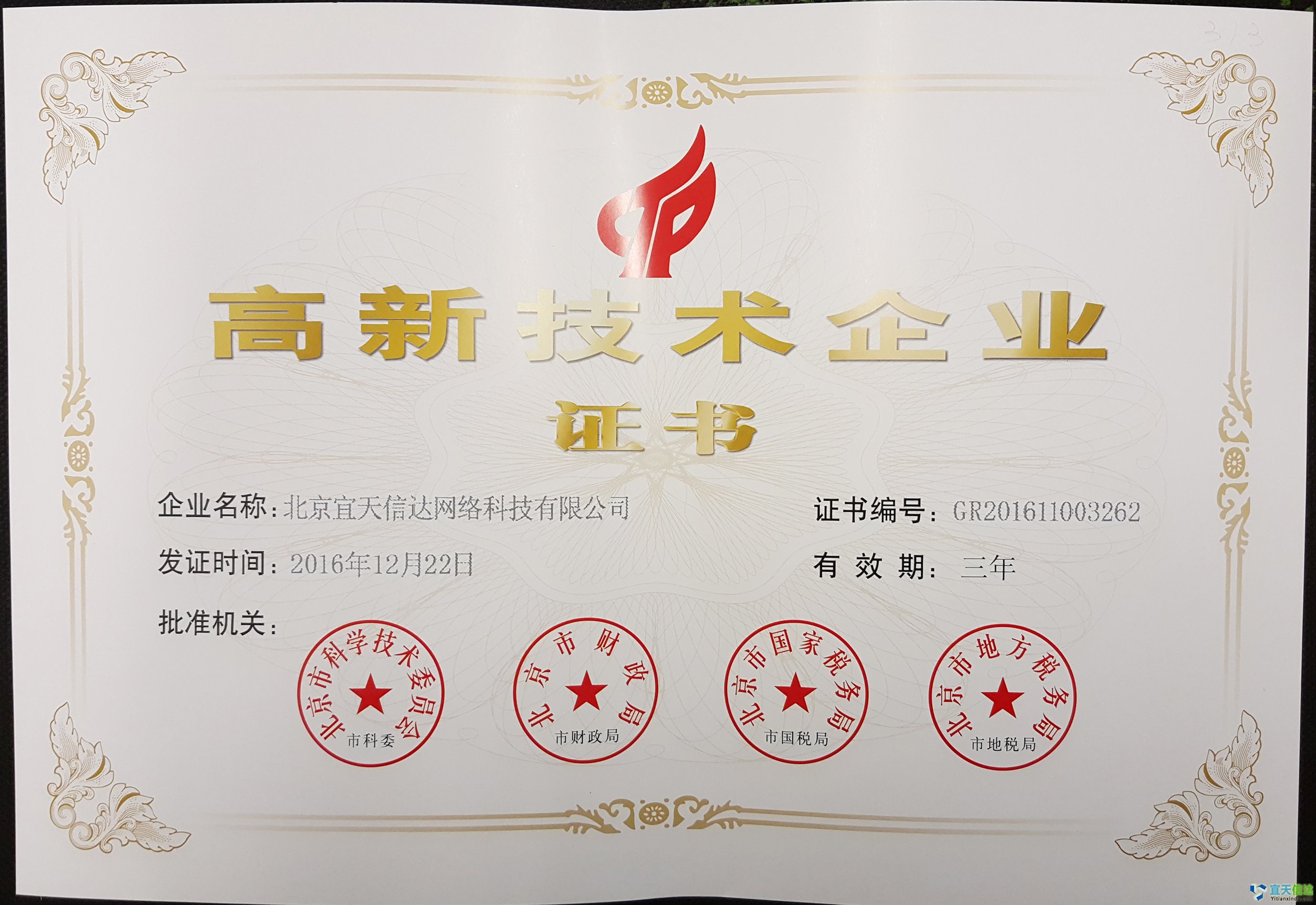 祝賀北京宜天信達(dá)網(wǎng)絡(luò)科技有限公司成為北京市2016年第二批認(rèn)定的高新技術(shù)企業(yè)_北京軟件開發(fā)公司