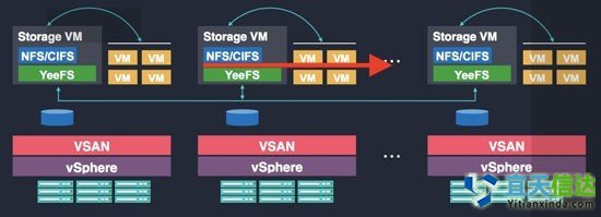VNAS是運(yùn)行在VMware虛擬中的一種NAS虛擬化服務(wù),它的部署非常簡(jiǎn)單,利用VSAN虛擬出來的硬盤,通過VMware的vSphere一鍵操作即可完成部署。其核心是達(dá)沃自主研發(fā)的分布式文件系統(tǒng)YeeFS,對(duì)外提供標(biāo)準(zhǔn)的NFS/CIFS接口,以及集群式NAS服務(wù)。由于它與VSAN運(yùn)行在同一個(gè)宿主機(jī)上,即使VMs遷移了,還是可以實(shí)現(xiàn)對(duì)StorgeVM的就近訪問,與VMs位置無關(guān)。另外,通過創(chuàng)新數(shù)據(jù)調(diào)度等技術(shù),VNAS提供全活集群的保障機(jī)制,因此當(dāng)本地StorgeVM故障時(shí),VMs仍可以通過其他Host上的StorgeVM繼續(xù)訪問相關(guān)數(shù)據(jù)。當(dāng)然,VNAS對(duì)故障的判斷,需要VSAN提供相應(yīng)的物理資源信息。